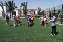 После утренней зарядки, дети соревновались на спортивной эстафете: бег со скакалкой, бег через обруч и ведение мяча одной рукой. После эстафеты ребята играли в футбол.