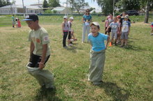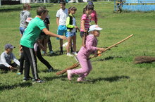 Бег в мешках, перетягивание каната, разбить горшок с завязанными глазами, достать монетку из посуды с водой и другие народные забавы были организованы для детей из пришкольного лагеря.