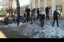 Сегодня в нашей школе прошёл субботник по очистке территории от снега и наледи.