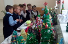 В фойе школы в рамках недели начальных классов организована выставка "Новогодние елки и игрушки".