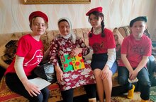 Юнармейцы поздравили Садыкову Мусалию Мухамадеевну - ветерана труда с предстоящим празднованием Дня Победы.