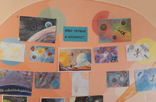 В школе проходит выставка работ учащихся посвящённая к Дню космонавтики «Мы первые в космосе!».