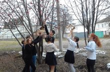 11 ноября в рамках Всероссийской акции “Сделано с заботой” активисты РДШ на деревьях школьного сада повесили кормушки для птиц.11 ноябрьдә “Кайгыртучанлык белән эшләнгән” Бөтенроссия акциясе кысасында РДШ активистлары мәктәп бакчасындагы агачларга кошлар өчен җимлекләр элделәр. -