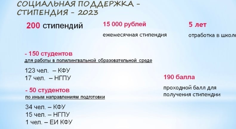 В Татарстане с 2016 года оказывается стипендиальная поддержка подготовки будущих учителей. Этот республиканский проект в первую очередь направлен на подготовку педагогов для сельской местности. Сегодня участниками проекта являются более 725 студентов, которые учатся в КФУ и НГПУ.