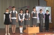Здравствуй, школа!! Таким плакатом на нескольких языках одиннадцатиклассники приветствовали учащихся и педагогов 1 сентября 2012 года. И, несмотря на дождливую погоду у всех было радостно на душе от новых встреч с друзьями, учителями, школой. Украшением праздника были , конечно же, первоклассники и учащиеся одиннадцатого класса. Выпускники подготовили замечательную торжественную линейку, где пели, танцевали, передавали огонь знаний первоклассникам и говорили свои пожелания ученикам на новый учебный год.