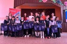 Нашим орлятам-первоклассникам и второклассникам торжественно вручили значки и мешки "Орлята Роосии", маленьких Барсиков.