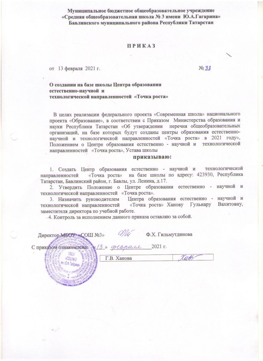 - Приказ № под-1435/20 от 30.12.2020 "О газначении лица, ответственного за создание и функционирование центров образования естественно-научной и технологической направленостей "Точка роста" в 2021-2023 годах"
