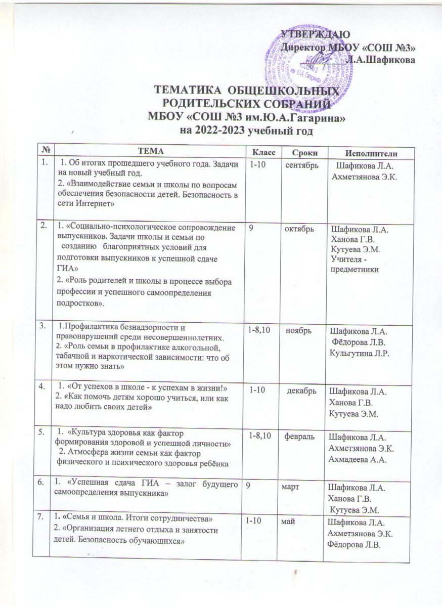 Тематика общешкольных родительских собраний МБОУ "СОШ №3 им.Ю.а.Гагарина" на 2022-2023 учебный год