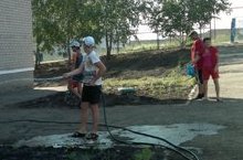 Учащиеся 8-х классов проходят практику: занимаются поливкой, уборкой территории школы.