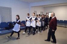 Среди учащихся 5-6 классов преподаватель-организатор ОБЖ Р.К.Ибрагимов проводит строевую подготовку