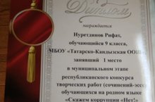 Поздравляем участников муниципального этапа республиканского конкурса творческих работ (сочинений-эссе) обучающихся на родном языке "Скажем коррупции "Нет!" Нуретдинова Рифата, ученика 9 класса (1 место) и Нургалиева Аяза, ученика 5 класса (2 место). Желаем успехов в учебе!
