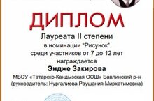 Дипломом лауреата II степени I Республиканского конкурса "Алиш и детство" среди детей дошкольного и школьного возраста награждена учащаяся 1 класса Закирова Эндже (рук. Нугалиева Р.М.). Поздравляем, желаем успехов!