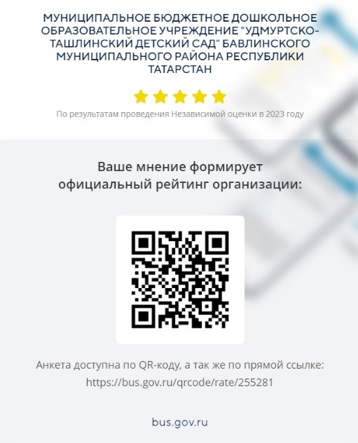 УВАЖАЕМЫЕ РОДИТЕЛИ!Данный QR-код дает возможность открыть страницу организации на сайте bus.gov.ru либо в мобильном приложения «Наше мнение» (на выбор пользователя) и получить возможность:оценить качество условий осуществления образовательной деятельности организацией и оставить отзыв;ознакомиться по результатам проведенной независимой оценки (функционал будет реализован в течение 2024 г.);оставить отметку о согласии или несогласии с результатами независимой оценки.СКАЧАТЬ: QR код для открытия страницы организации -