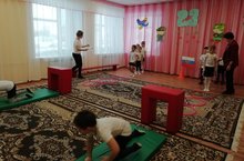Начинаем мы с медленных и плавных движений на кровати, затем застилаем дружно кровати и переходим в игровую комнату, где ребят ждет увлекательное путешествие через препятствия.