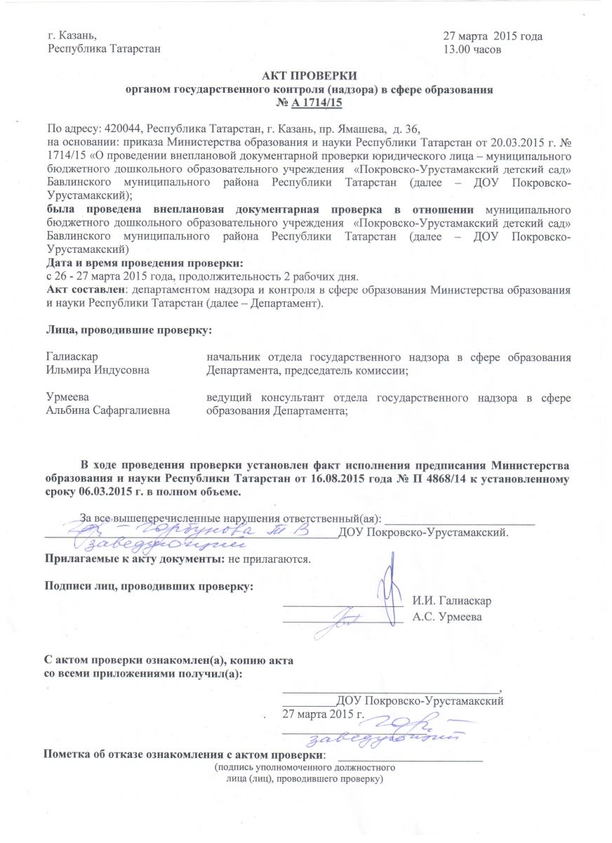 Акт проверки органом государственного контроля (надзора) в сфере образования № А 1714/15