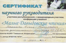 Педагог дополнительного образования СДЮТиЭ Маханько О.Н.14апреля 2018 года приняла участие. в качестве научного руководителя. в республиканской конференции учащихся, «Малые Давыдовские чтения» с международным участием.Конференция проходила на базе ФГОУ ВО « Набережночелнинский государственный педагогический университет» Н(ч)ЭОУ «Гимназия им. В.В, Давыдова».Ей был вручен Сертификат научного руководителя.