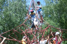 Ну кто устоит перед такими лабиринтами? Ребятишки, как скалолазы преодолевают препятствия и добираются до вершины. Так проходят наши прогулки. Столько развлечений: качели, горки, карусели и паутина. Всё это находится в центре города. далеко от школы, где находится пришкольный лагерь, но для нас это не препятствие.