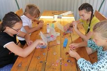 Девочки из студии , Самоделкин" собрались не только поделиться впечатлениями летнего отдыха, но и сплести из бисера яркие аксессуары. -