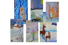 На рисунках ребят- чудесная природа, зимние забавы, животные и птицы зимой. -