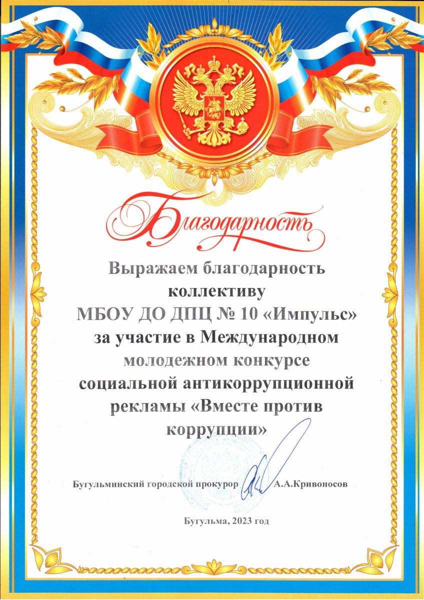 Благодарность коллективу за участие в Международном молодежном конкурсе социальной аникоррупционной рекламы Благодарность/1.jpg