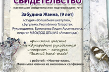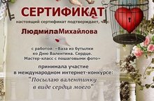 Сертификат выдан Михайловой Людмиле Алексеевной за участие в Международном интернет конкурсе "Посылаю валентинку в виде сердца моего".На конкурс была представлена работа "Ваза из бутылки" в форме мастер - класса с пошаговым представлением исполнения.