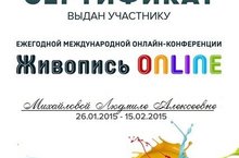 Сертификат выдан участнику Михайловой Людмиле Алексеевной в Международной онлайн - конференции "Живопись - онлайн"