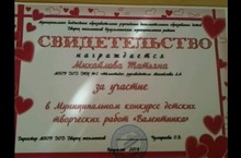 Награждается Михайлова Татьяна свидетельством за участие в муниципальном конкурсе "Валентинка"
