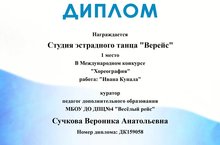 Диплом 1 место , номинация хореография, награждается студия "Верейс" 29.10.2020