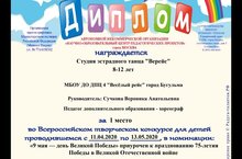 Диплом всероссийского конкурса для детей.Награждается студия эстрадного танца "Верейс" .Номинация "9мая- день Великой Победы приурочен к празднованию 75-летия Победы.Руководитель Сучкова Вероника Анатольевна 20.05.2020