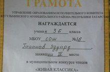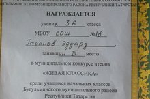 Ученик 3б кл. занял 3 место в муниц.конкурсе чтецов "Живая Классика"среди участников начальных класов Бугульминского района РТ. Педагог Гаврилова О.А. 15.03.2018