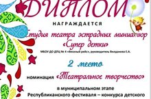 Поздравляем воспитанников студии театра эстрадных миниатюр "Супер детки", занявших 2 место в муниципальном этапе Республиканского фестиваля-конкурса детского народного творчества "Татанты Татарстана". Педагогу Вилдановой (Матвеевой) Екатерине Александровне выражаем благодарность!