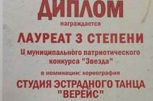 Студия эстрадного танца "Верейс приняли участие в патриотическом конкурсе "Звезда" заняли Лауреата 3 степени. Поздравляем!! 25.04.2023