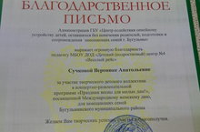 Благодарственное письмо!!!!!Администрация ГБУ"Центр содействия семейному устройству детей,оставшихся без попечения родителей,подготовки и сопровождения замещающих семей г. Бугльма"выражает огромную благодарность педагогу Сучковой Веронике Анатольевне за участие творческого детского коллектива в концертно-развлекательной программе" Праздник весны для милых дам". 22.03.2017