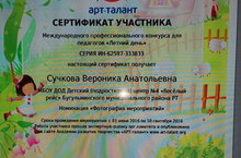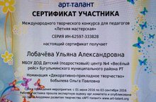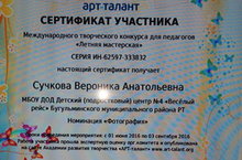 Сертификат Международного творческого конкурса для педагогов «Летняя мастерская» 28.08.2016