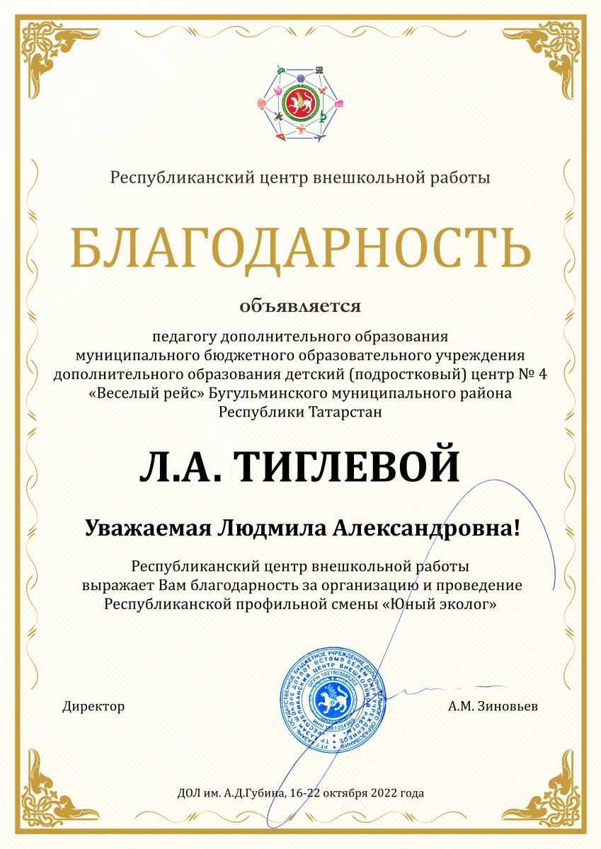 Педагогических и руководящих работников - участник профильной смены в 2022-2023 учебном году педагог дополнительного образования Тиглева Людмила Александровна Благодарность Тиглевой Л А за профильную смену.jpg