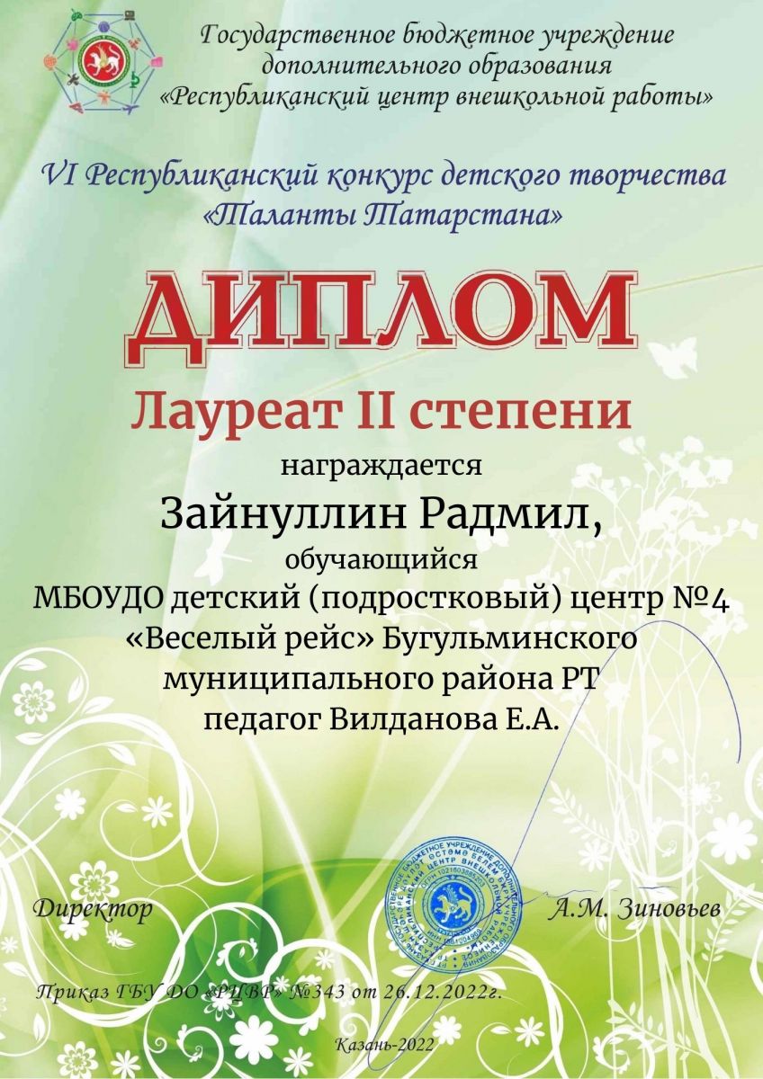 15. VI Республиканский конкурс детского творчества "Таланты Татарстана" Зайнуллин Радмил Диплом Лауреат 2 степени.jpg