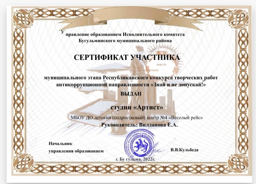 16. Муниципальный этап Республиканского конкурса творческих работ антикоррупционной направленности "Знай и не допускай!"Студия театра "Артист"Сертификат участникаjpg