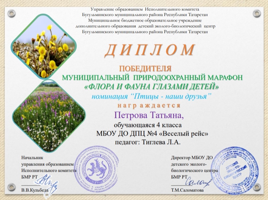 47. Муниципальный природоохранный марафон "Флора и фауна глазами детей" Диплом победителя Петрова Татьяна ИЗОбраз.jpg