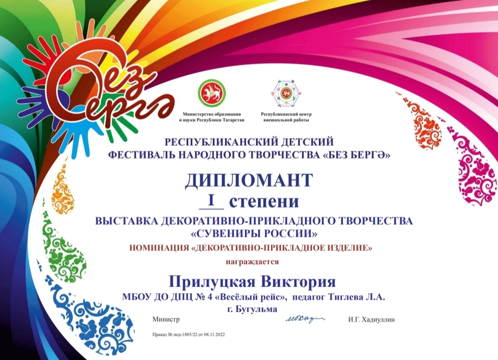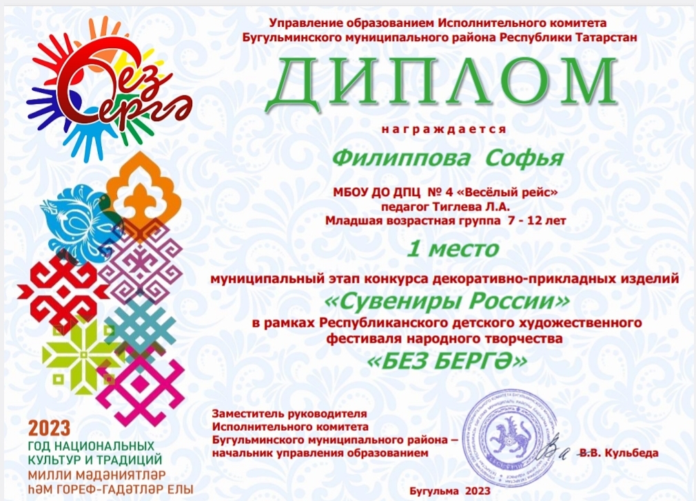 55. Муниципальный этап конкурса декоративно-прикладных изделий "Сувениры России" в рамках Республиканского детского художественного фестиваля нородного творчества "Без берге" Диплом 1 место Филиппова Софья ИЗОбраз.jpg