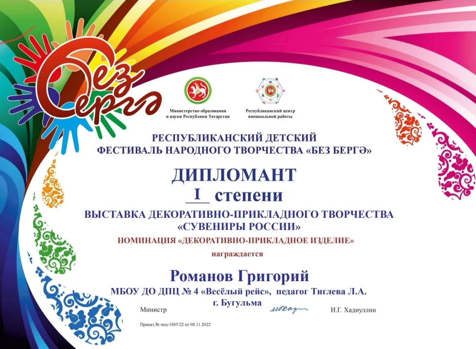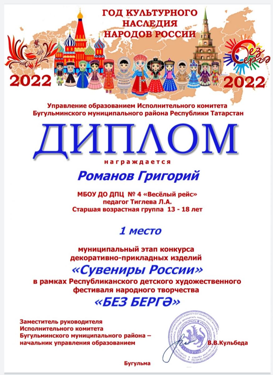 37.Муниципальный этап конкурса декоративно- прикладных изделий "Сувениры России" в рамках Республиканского детского художественного фестиваля народного творчества "БЕЗ БЕРГЭ" 1 место Диплом Романов Г