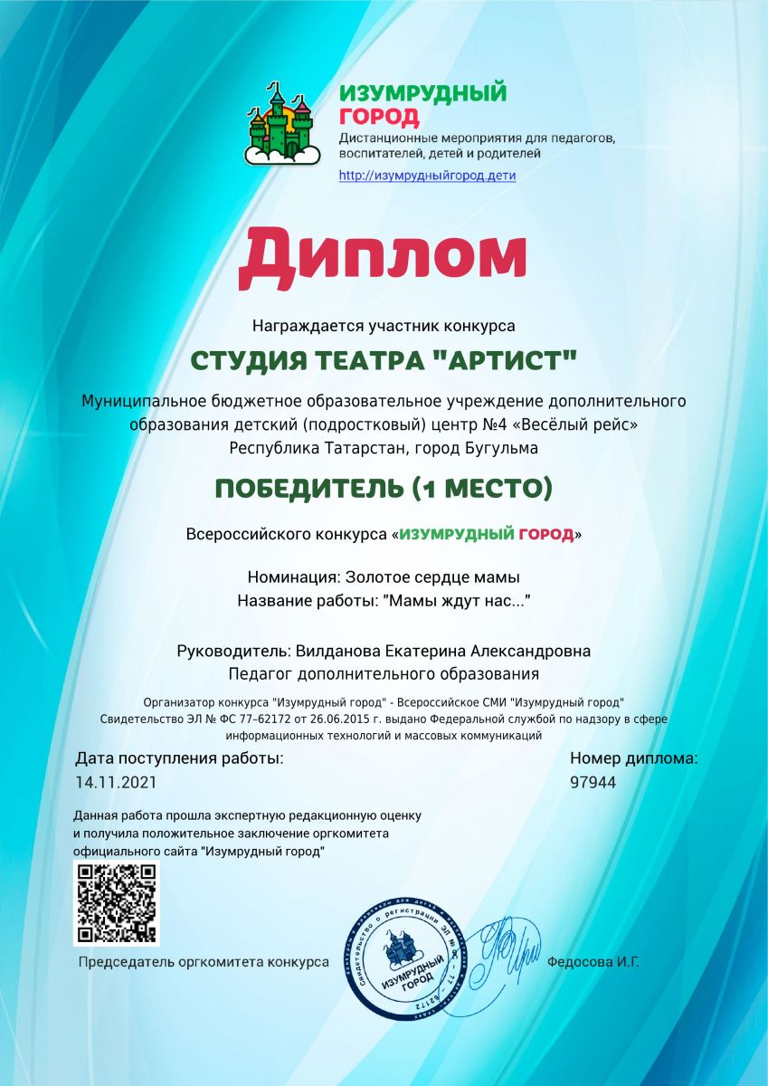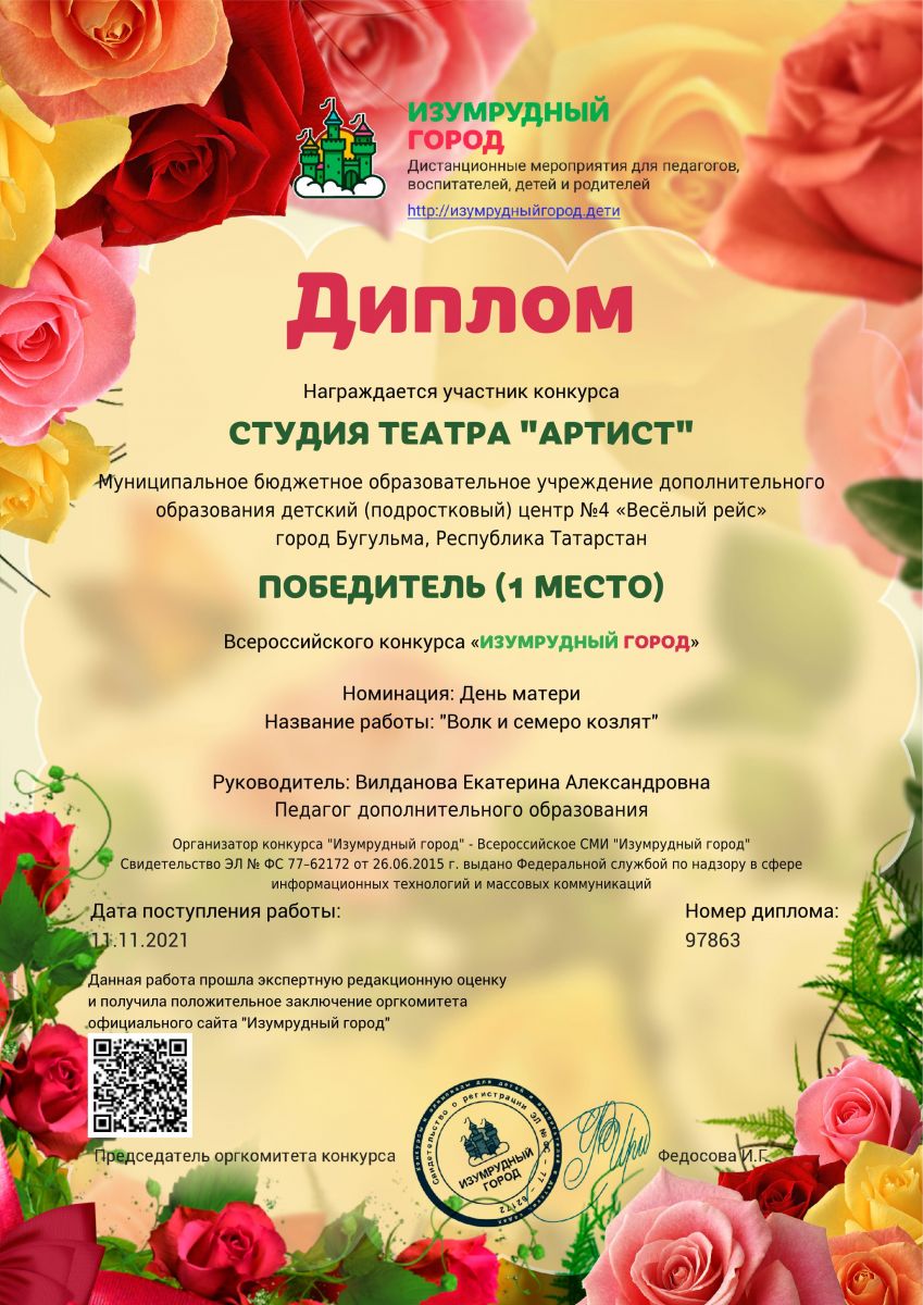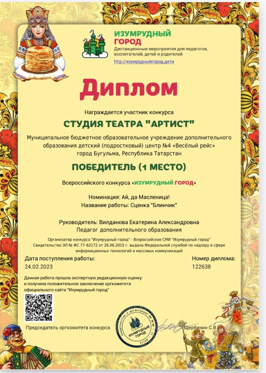 18. Всероссийский конкурс "Изумрудный город" - номинация "Ай, да Масленица!" Студия театра "Артист" Диплом победителя 1 место.jpg