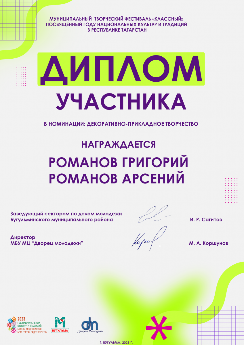 51. Муниципальный творческий фестиваль "Классный", посвященный году национальных культур и традиций в Республике Татарстан, Диплом участника Романов Григорий Романов Арсений ИЗОбраз.png