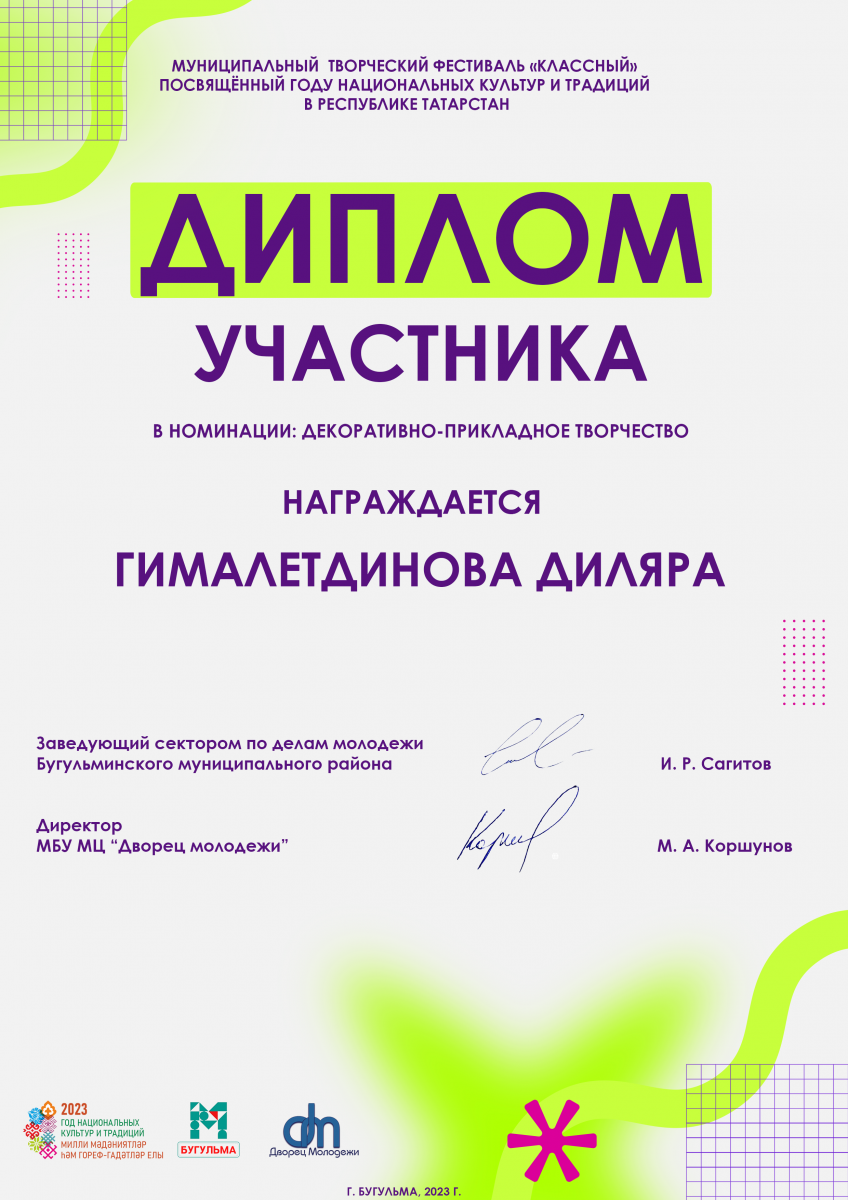 52. Муниципальный творческий фестиваль "Классный", посвященный году национальных культур и традиций в Республике Татарстан Диплом участника Гималетдинова Диляра ИЗОбраз.png