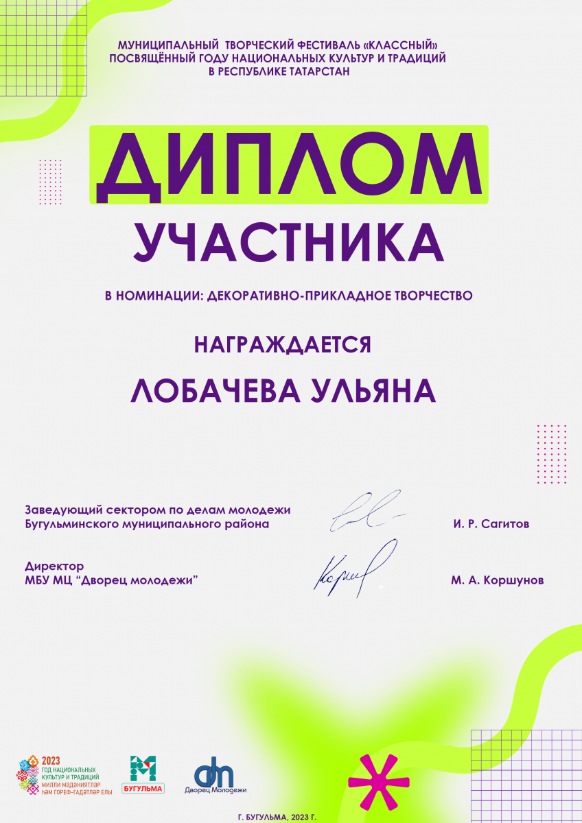53. Муниципальный творческий фестиваль "Классный", посвященный году национальных культур и традиций в Республике Татарстан Диплом участника Лобачёва Ульяна ИЗОбраз.png