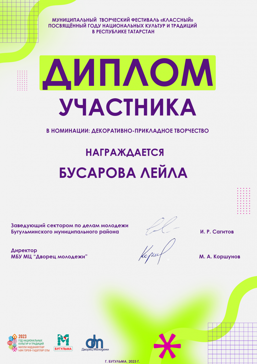 54. Муниципальный творческий фестиваль "Классный", посвященный году национальных культур и традиций в Республике Татарстан Диплом участника Бусарова Лейла ИЗОбраз.png