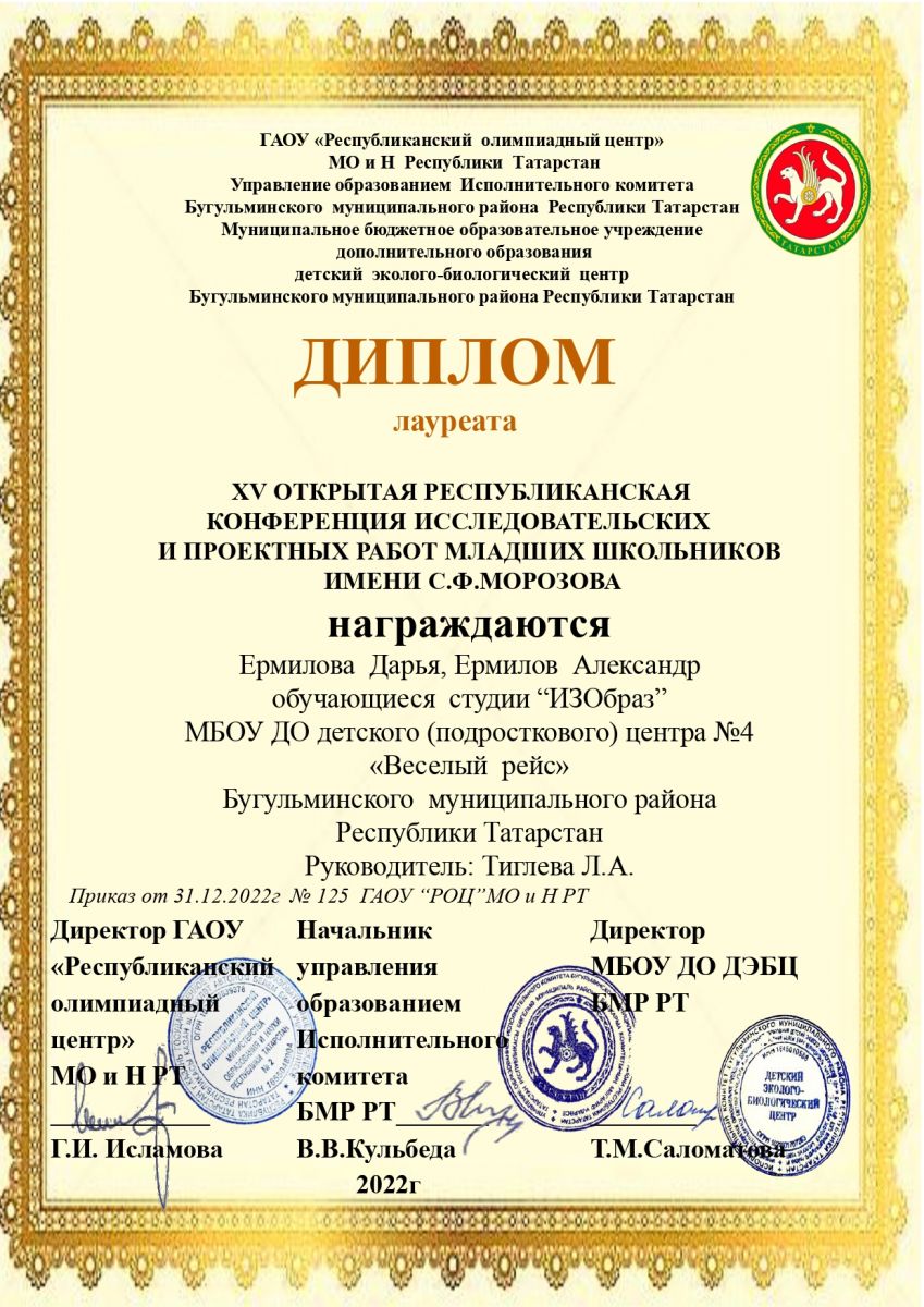 36. XV Открытая Республиканская конференция исследовательских и проектных работ младших школьников им. С.Ф. Морозова, Ермилова Дарья, Ермилов Александр, ИЗОбраз, Диплом лауреатаjpg