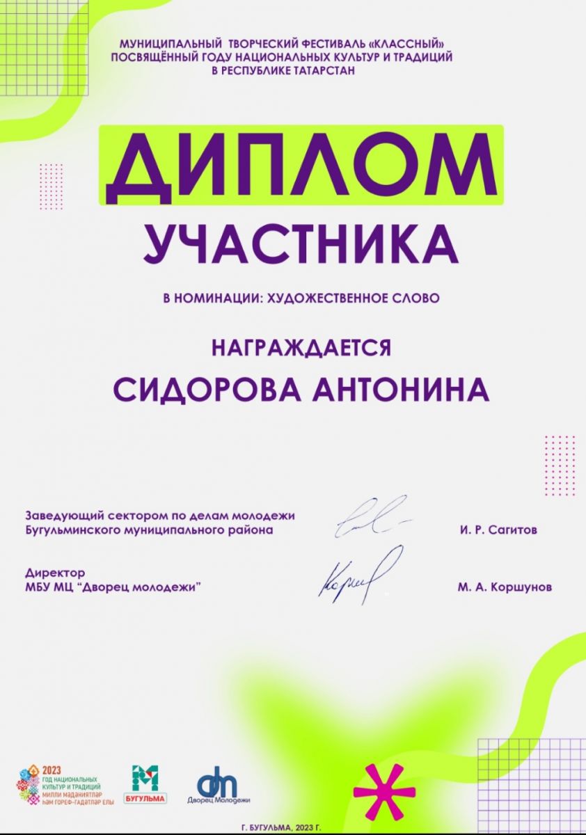 19. Муниципальный творческий фестиваль "КЛАССНЫЙ", посвященный году национальных культур и традиций в Республике Татарстан Сидорова Антонина Диплом участника.jpg