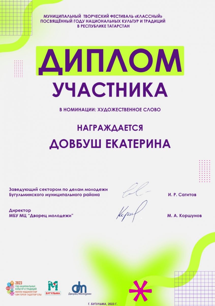 20. Муниципальный творческий фестиваль "КЛАССНЫЙ", посвященный году национальных культур и традиций в Республике Татарстан Довбуш Екатерина Диплом участника.jpg