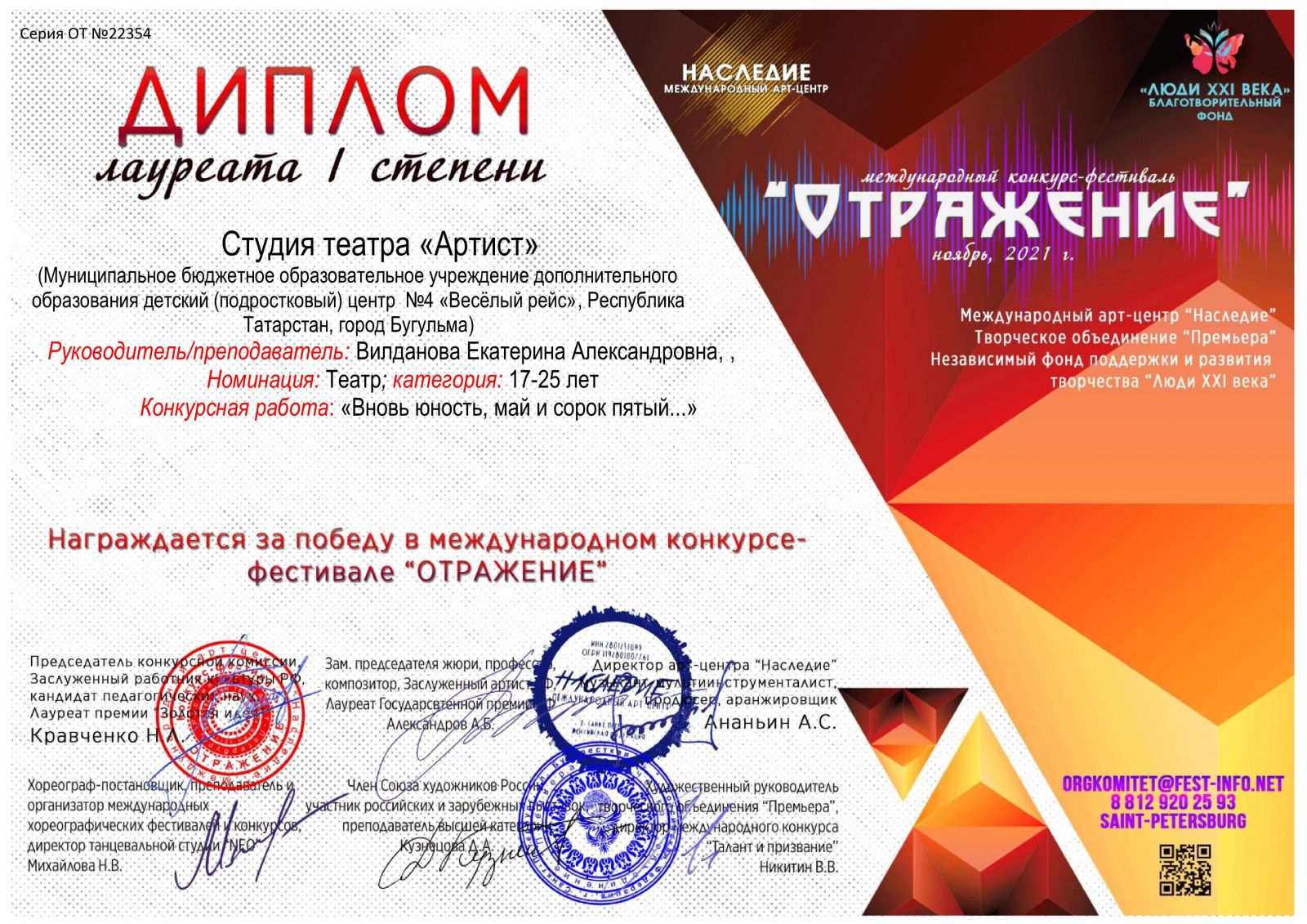 23. Международный конкурс-фестиваль "Отражение" лауреат 1 степениДиплом