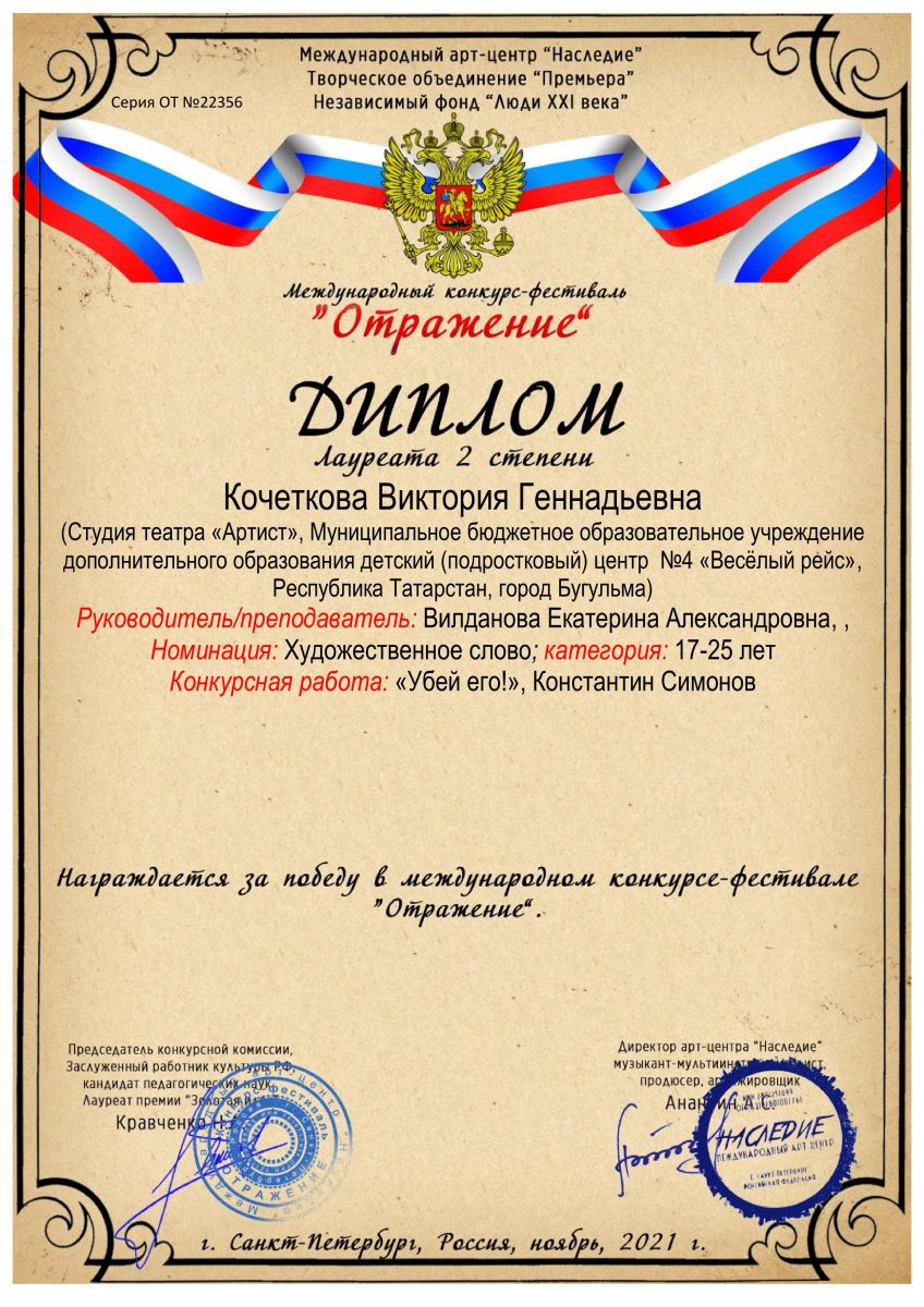 22. Международный конкурс-фестиваль "Отражение" лауреат 2 степениДиплом